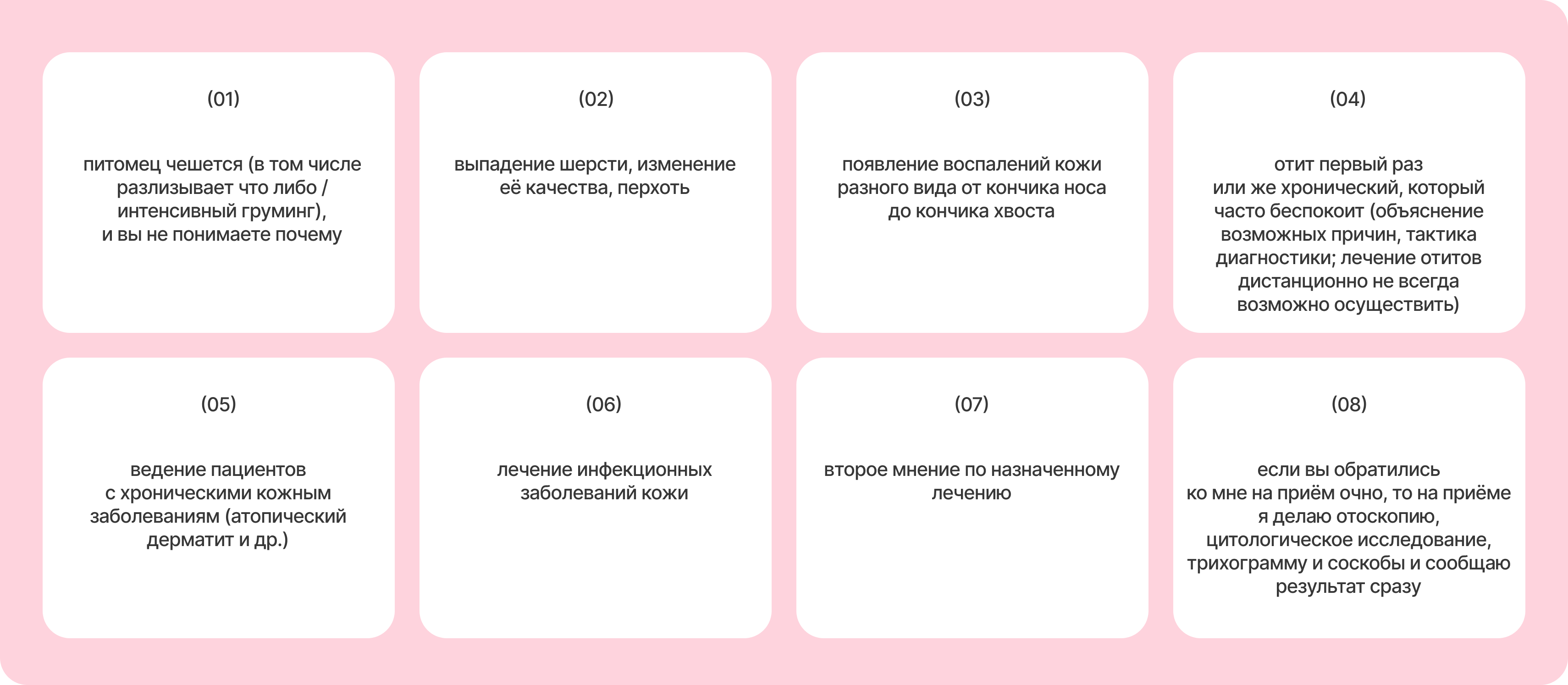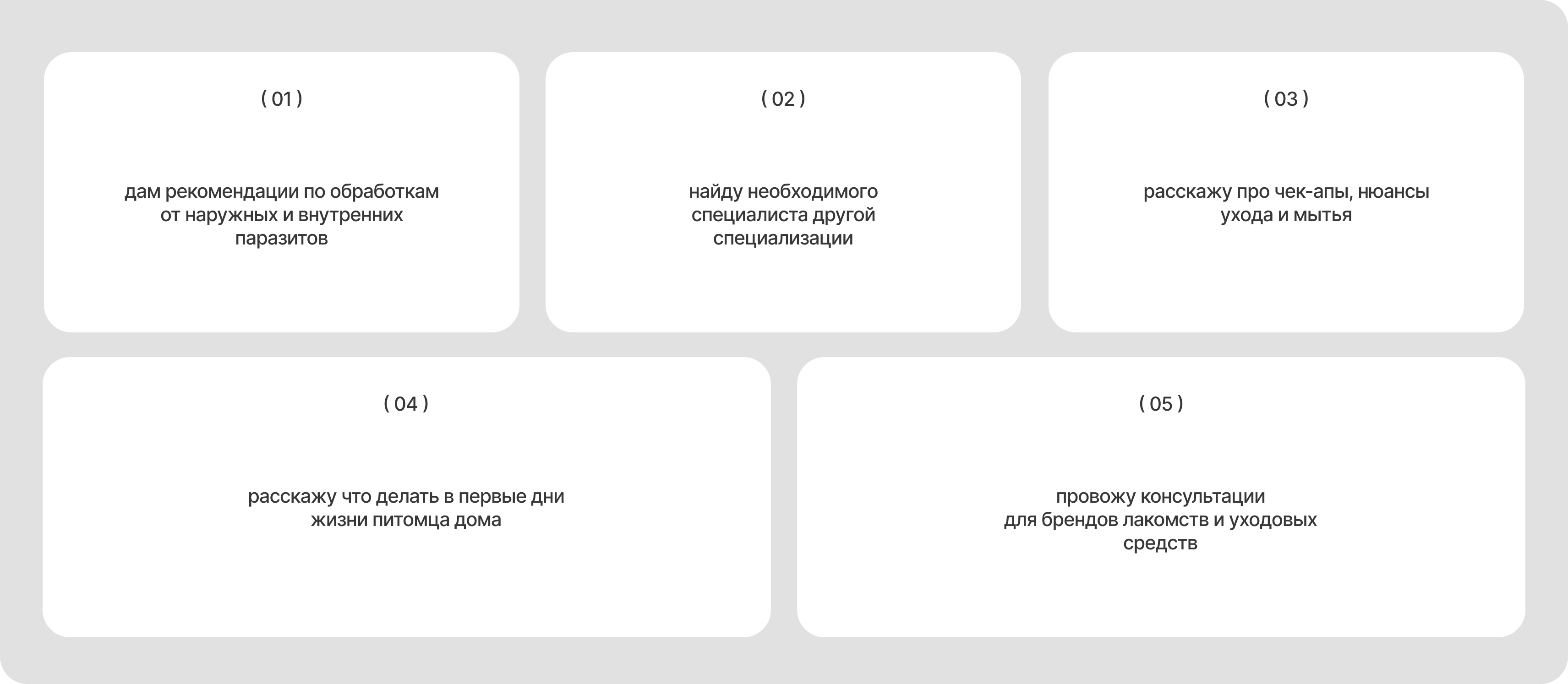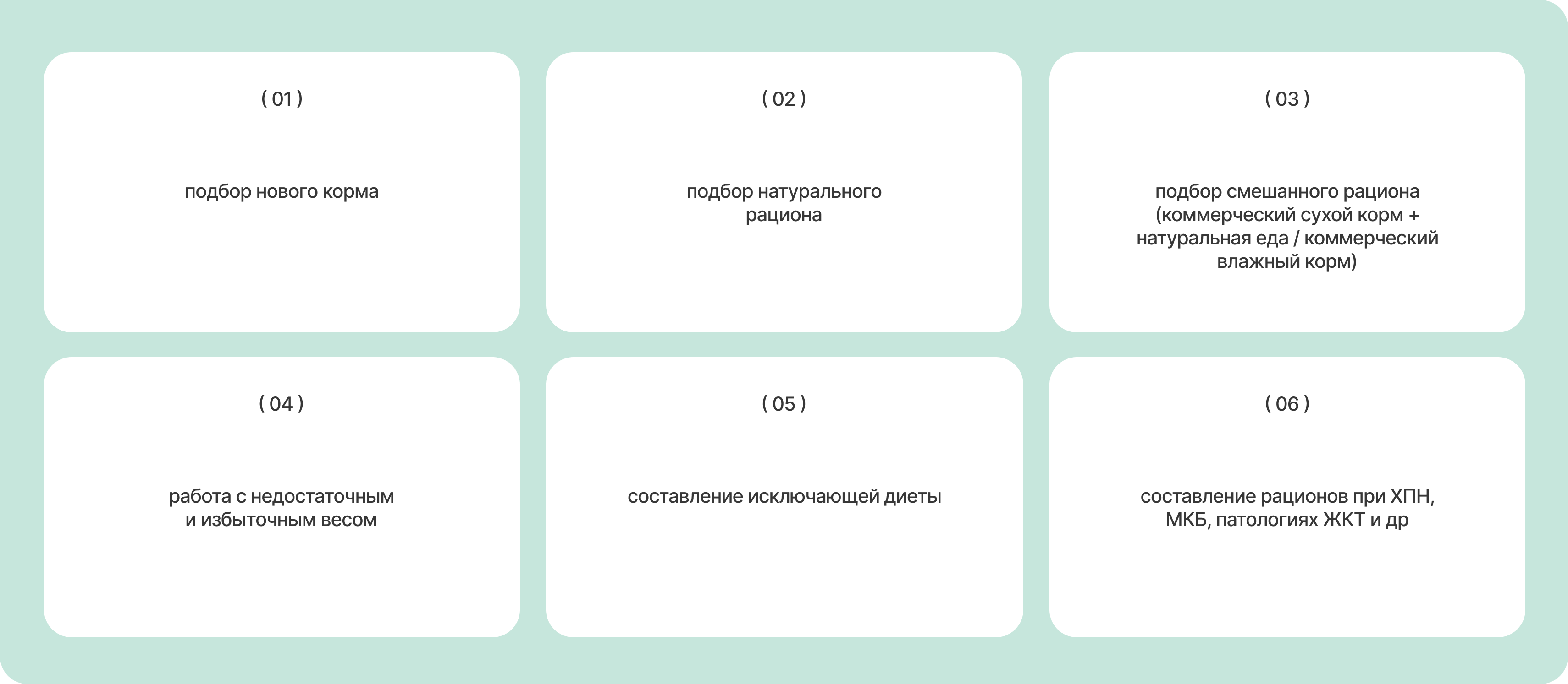 Составление сбалансированных рационов (1−2 варианта) с учетом физиологических особенностей, здоровья, предпочтений питомца и ваших пожеланий.